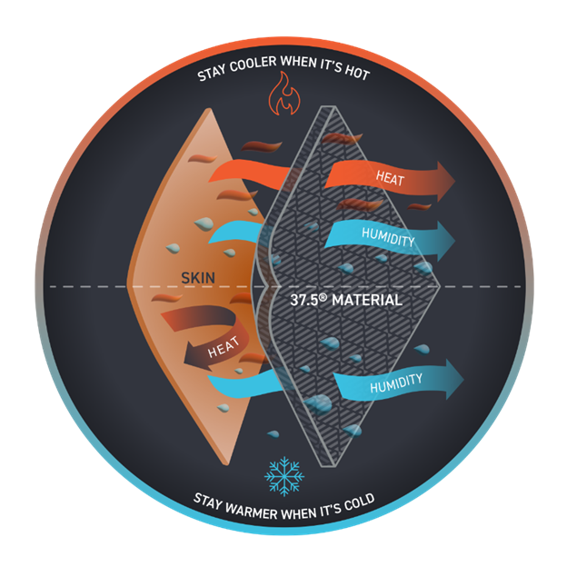 The temperature regulating materials powered by 37.5 Technology work by absorbing the infrared (IR) energy your body naturally emits, which energizes our active particles to speed evaporation and remove humidity next to your skin.
